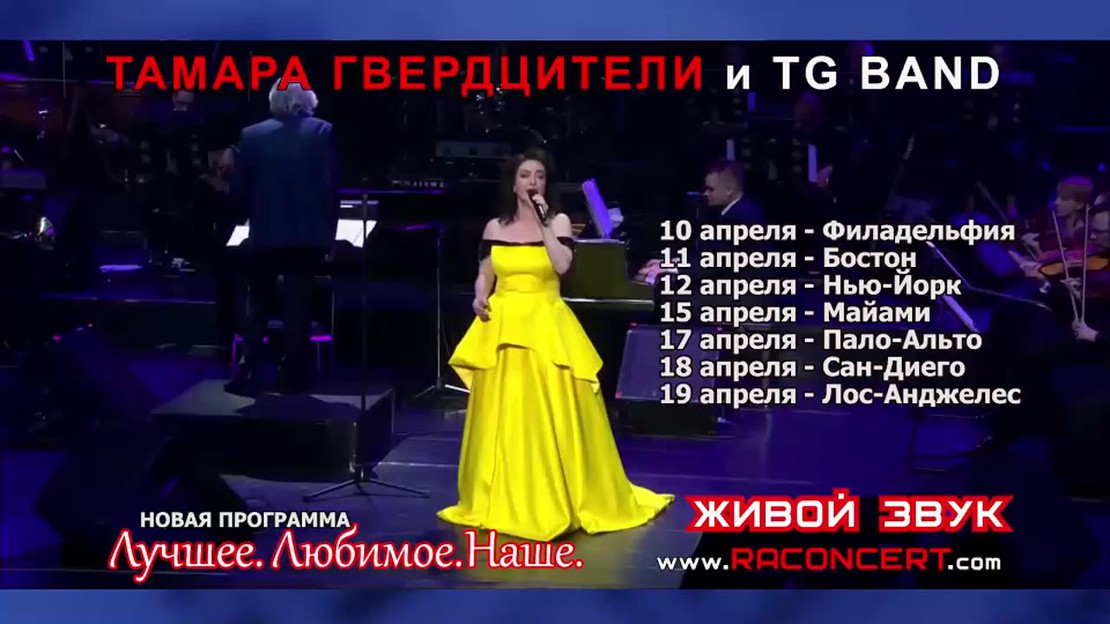 Тамара Гвердцители в туре по США с программой "Лучшее. Любимое. Наше". Любимые хиты, новые песни и тот самый голос, который невозможно забыть. От "Виват, Король, Виват!" до мировой классики — вечер, наполненный эмоциями, искренностью и магией живого исполнения любимо певицы и виртуозного оркестра TG Band. Концерт, который трогает сердце и остается в памяти надолго. Билеты на Showimpulse.com и Raconcert.com