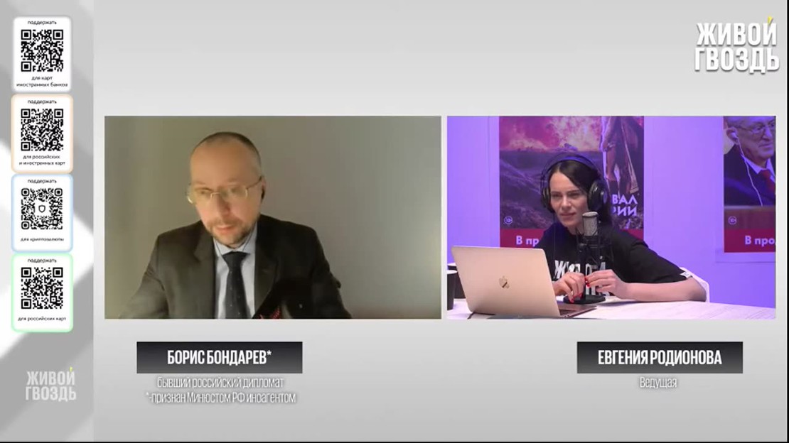 В прямом эфире на вопросы зрителей отвечает бывший российский дипломат Борис Бондарев.