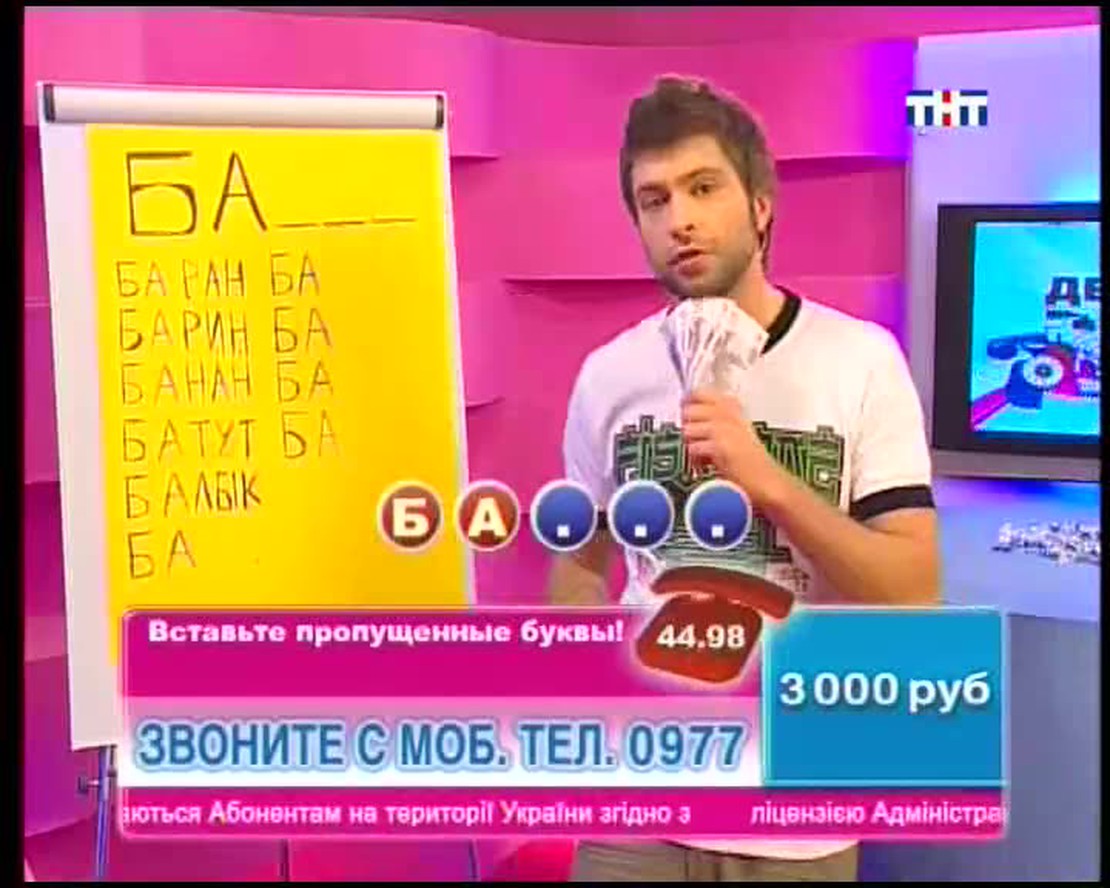 Назовите столицу европейского государства на букву "Х". В названии какой программы ТНТ целых две буквы Ы? ЕЛТЕОРВЗИ тоже имеет отношение к ТНТ. Переставьте буквы и получите слово. Ведущий телевикторины Сергей Блохин задает в прямом эфире вопросы. Если Вы знаете правильные ответы, можете позвонить, сообщить их и заработать денег!