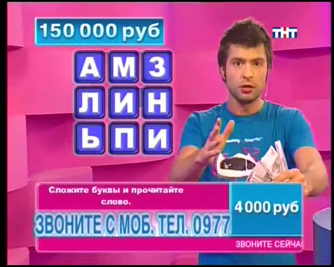 Назовите столицу европейского государства на букву "Х". В названии какой программы ТНТ целых две буквы Ы? ЕЛТЕОРВЗИ тоже имеет отношение к ТНТ. Переставьте буквы и получите слово. Ведущий телевикторины Сергей Блохин задает в прямом эфире вопросы. Если Вы знаете правильные ответы, можете позвонить, сообщить их и заработать денег!
