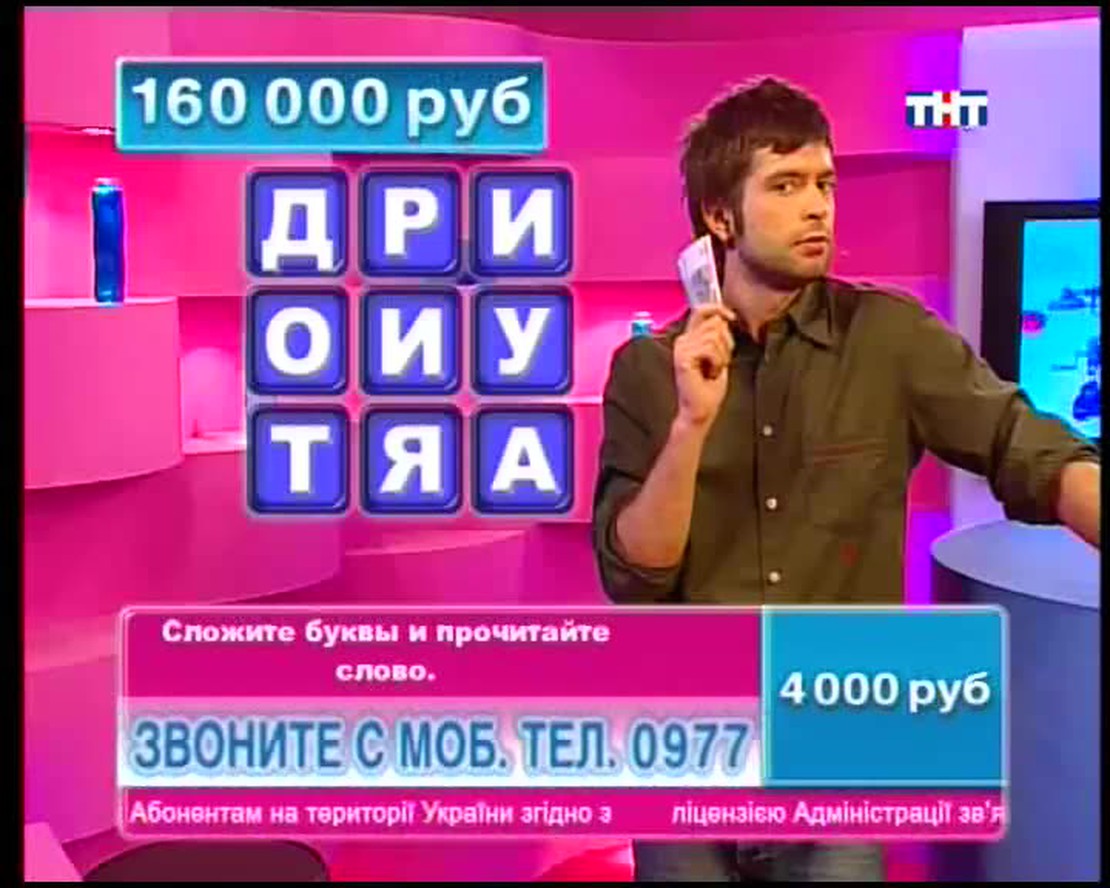 Назовите столицу европейского государства на букву "Х". В названии какой программы ТНТ целых две буквы Ы? ЕЛТЕОРВЗИ тоже имеет отношение к ТНТ. Переставьте буквы и получите слово. Ведущий телевикторины Сергей Блохин задает в прямом эфире вопросы. Если Вы знаете правильные ответы, можете позвонить, сообщить их и заработать денег!