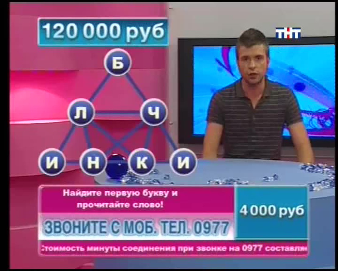Назовите столицу европейского государства на букву "Х". В названии какой программы ТНТ целых две буквы Ы? ЕЛТЕОРВЗИ тоже имеет отношение к ТНТ. Переставьте буквы и получите слово. Ведущий телевикторины Сергей Блохин задает в прямом эфире вопросы. Если Вы знаете правильные ответы, можете позвонить, сообщить их и заработать денег!