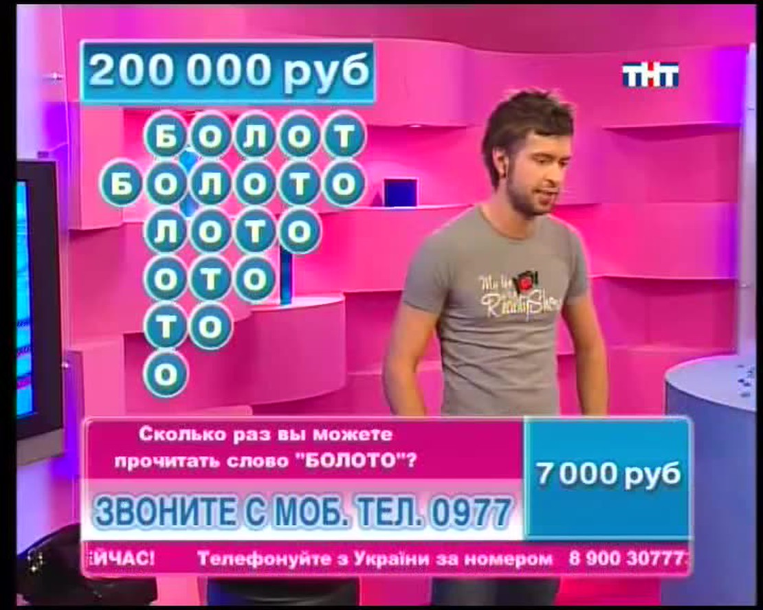 Назовите столицу европейского государства на букву "Х". В названии какой программы ТНТ целых две буквы Ы? ЕЛТЕОРВЗИ тоже имеет отношение к ТНТ. Переставьте буквы и получите слово. Ведущий телевикторины Сергей Блохин задает в прямом эфире вопросы. Если Вы знаете правильные ответы, можете позвонить, сообщить их и заработать денег!