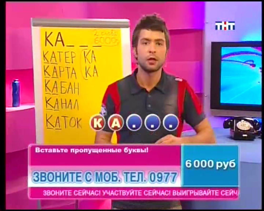 Назовите столицу европейского государства на букву "Х". В названии какой программы ТНТ целых две буквы Ы? ЕЛТЕОРВЗИ тоже имеет отношение к ТНТ. Переставьте буквы и получите слово. Ведущий телевикторины Сергей Блохин задает в прямом эфире вопросы. Если Вы знаете правильные ответы, можете позвонить, сообщить их и заработать денег!