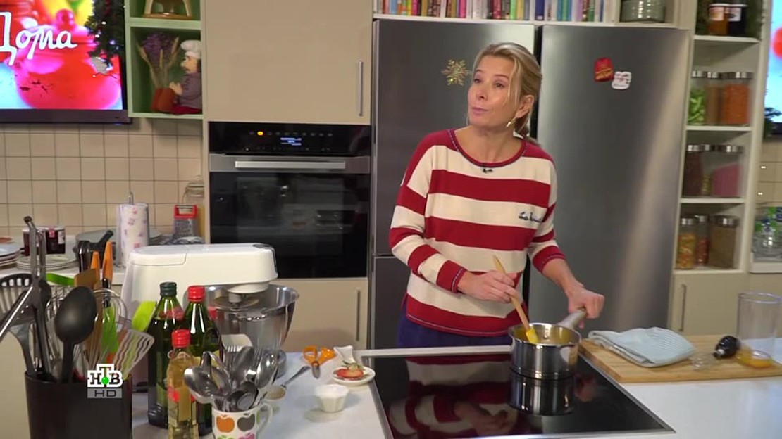 На кухне у Юлии Высоцкой — "репетиция" приготовления новогодних яств! Ведущая показала, как приготовить рождественские булочки с марципаном, изюмом и вишней и феттучине с креветками, чесноком и базиликом, а также поделилась рецептом пряных рыбных рулетиков, запеченных в виноградных листьях.