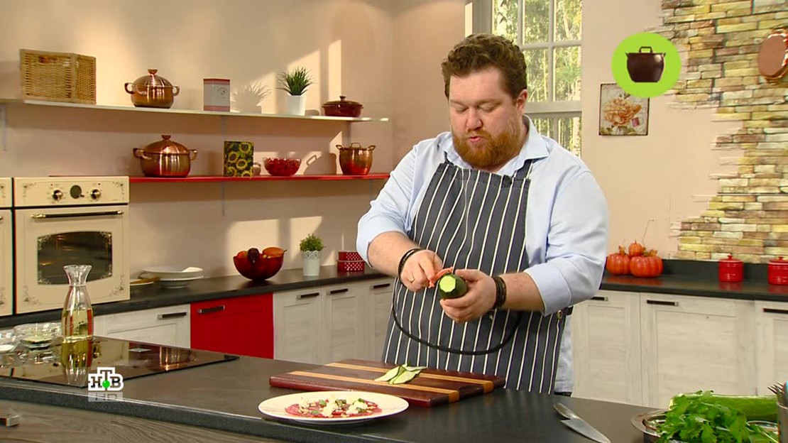 "Готовим с Алексеем Зиминым" — шоу о том, как готовить по-ресторанному вкусно на домашней кухне. В это осеннее утро Алексей Зимин приготовил урожайный обед, состоящий из карпаччо с кедровыми орешками, аппетитных запеченных куриных окорочков с цукини, а также — арбузно-дынного салата на десерт. Также в программе — идеи для сервировки стола и секреты фэн-шуй.