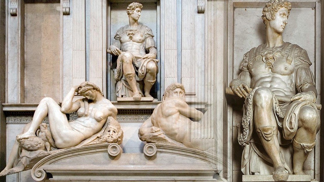 Во Флоренции, в церкви Сан-Лоренцо находится знаменитая гробница Медичи, созданная Микеланджело Буонарроти. В любой книге, посвященной творчеству мастера, подробно описываются четыре статуи, олицетворяющие времена суток, — "Утро", "День", "Вечер", "Ночь". Но это лишь часть ансамбля, задуманного мастером.