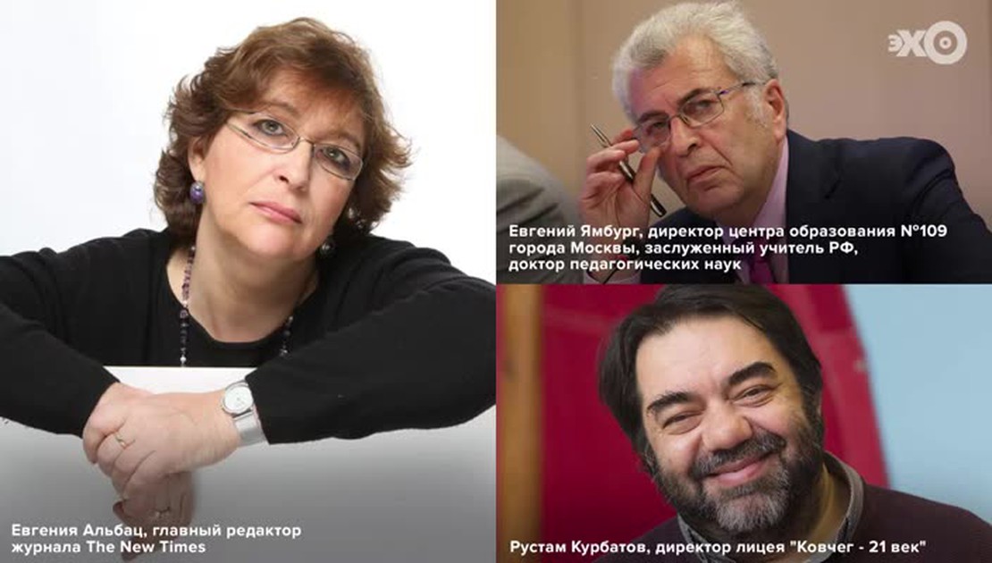 Главное событие нынешней недели – это 1 сентября. Начало нового учебного года. И тему этой передачи Евгения Альбац попросила обозначить как: 1 сентября при авторитарном режиме. Все остальные аллюзии, пожалуйста, вспоминайте сами. Сегодня в студии два директора школы. Евгений Ямбург, директор центра образования №109 города Москвы, заслуженный учитель РФ, доктор педагогических наук и второй гость — Рустам Курбатов, директор частной школы, лицея "Ковчег — 21 век".