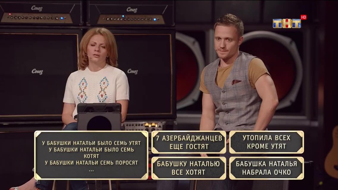Каждый четверг в эфире ТНТ новое и единственное в своем роде комедийно-музыкальное шоу, в котором звезды ТНТ меряются музыкальностью, чтобы сделать тебе очень смешно! Для этого каждый четверг им придется погружаться в мир изощренной русской эстрады, и только юмор и самоирония помогут им выстоять в этой схватке. Отныне четверги не будут прежними... Хотя бы потому, что в этом абзаце слово "четверг" повторяется целых четыре раза! А нет, уже пять. В этот четверг участники: Наталья Андреевна, настоящ...