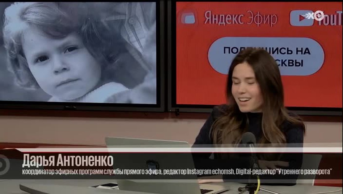 Координатор эфирных программ службы прямого эфира, редактор Instagram https://instagram.com/echomsk/, Digital-редактор "Утреннего разворота", редактор эфирных передач в подкастах Дарья Антоненко отвечает на ваши вопросы в чате и на сайте "Эхо-Москвы".